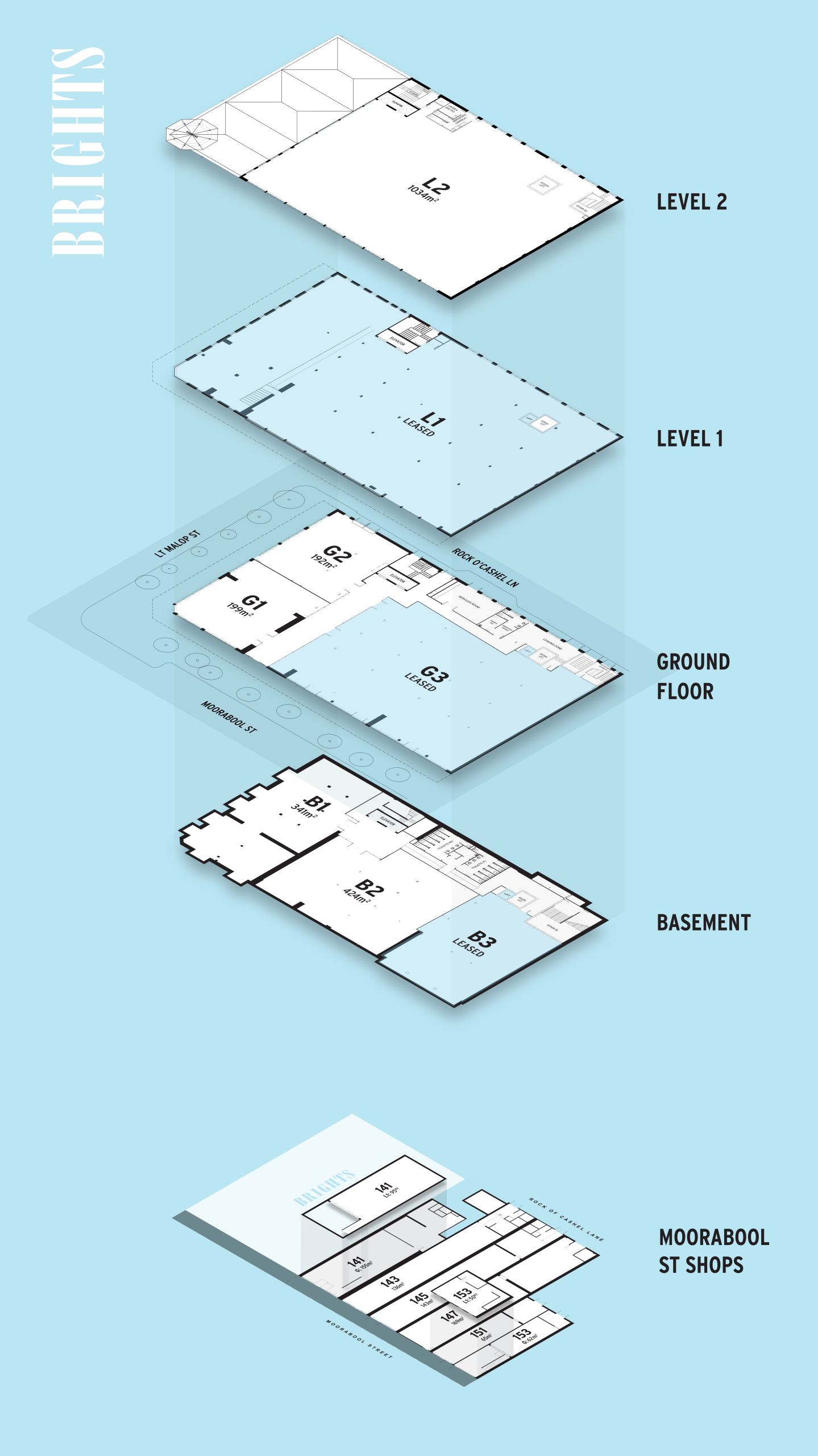 The Bright & Hitchcocks building spans three levels plus a basement, occupying a prominent corner at Moorabool Street and Little Malop Street, with a third frontage to Rock O’Cashel Lane and two adjoining strip shops along Moorabool Street. Its size, location, and heritage make it a unique opportunity in the heart of Geelong.